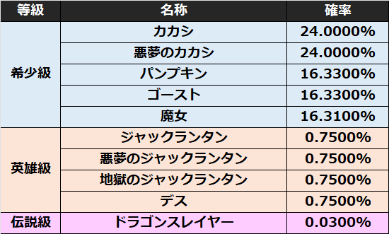 ※入手アイテムごとに個別に表示している入手確率は、表示のためすべて合算しても100%にならない場合がございます。