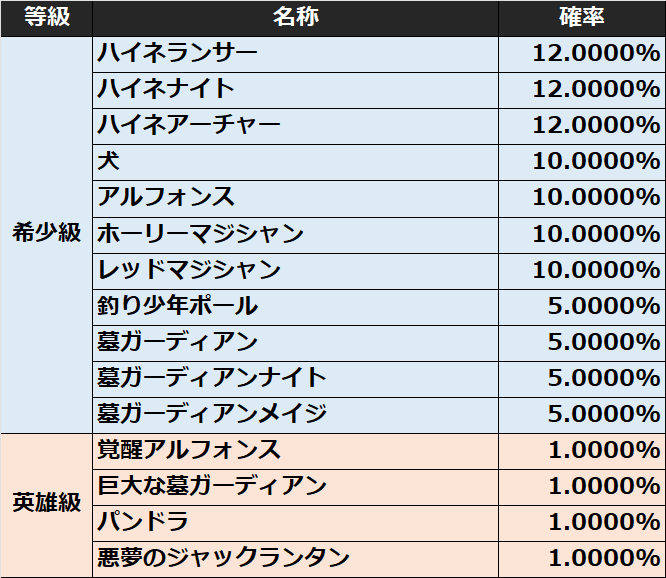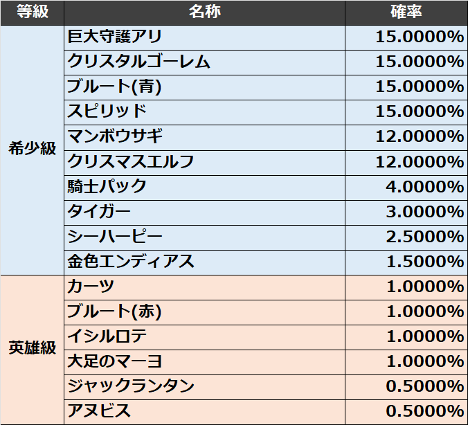 ※入手アイテムごとに個別に表示している入手確率は、表示のためすべて合算しても100%にならない場合がございます。